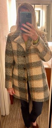 A cozy medium weight coat, perfect for the winter spring transition. Soft material and plenty of room in the bust to button the coat with no pulling which is rare. I'd say it runs a little big which was a plus! Will rent again.