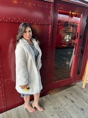 The reviews said it would “dress up” my outfits. I didn’t see that at all. I felt a little like a sheep dog. But a cute sheep dog (I would have tethered look more stylish). But it was the perfect weight for March in Europe. Warm without being too heavy and light to carry through airports (and made the perfect cozy blanket) on my transatlantic flight. I also liked that it hit right at the knee since I am short usually long coats are too long.