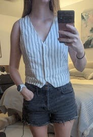 Off-white stripe (75% Viscose, 25% Linen). Vest. V-neck. Sleeveless. Button front closure. Shoulder to hemline: 19". Imported.