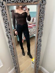 If you need to move around, this top won't stay on your shoulders very well. It is worth it, though, with this unique cut and warm chocolate brown with hints of sparkle. It is definitely cropped so be ready to show some skin.