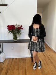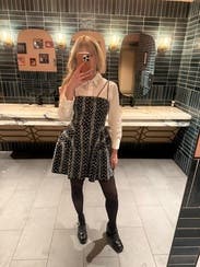 Was worried this dress was going to be too short for me but pairing it with a cute pair of sneakers made it just perfect. Material is thick, so not a summer dress. Stretchy so if between sizes, size down. Adjustable straps! Wish I had another place to wear this one before returning.