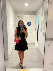 Event: friend's rehearsal dinner at country club Pros: fabric is thick - not restrictive but holds well & in all the right places | bow on shoulders are SO cute | extremely #chic #elegant #flirty #classy #flattering | ruffled skirt stayed put in the wind! Cons: a little hard to zip up because the fabric is thicker & zipper is dainty | could be a little short on someone who is tall (I'm 5'3") I felt classy & timeless with a healthy bit of cute/sexy too. :)