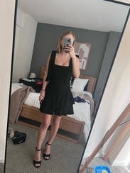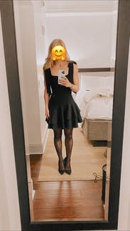 A little different take on a little black dress. The shoulder bows are unique and we're flattering for my arms. I felt like it concealed my tummy a little and was a great length. I would recommend.