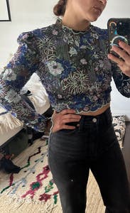 I rented this top to go with a pair of pants I already owned for New Years. The top looked even better in person. The detail is so intricate, and the iridescent sequins really make it something special. I also loved the scalloped trim around the neck and wrists. I wear a size medium in tops very consistently, and the medium was perfect.