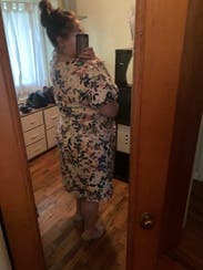 Wore to a shower. A little loose in the waist. I loved the material, shoulders, and print. I wished I had purchased!!