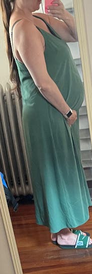 This would be a great dress for anyone late in their pregnancy because there is so much room. Wore this to a wedding at 22 weeks and there were people who had no idea I was pregnant because my bump was almost invisible. The dress was a very pretty green and longer than expected, but I am very petite! Be mindful of your undergarment lines as the material is very thin, but not see through.