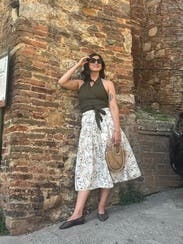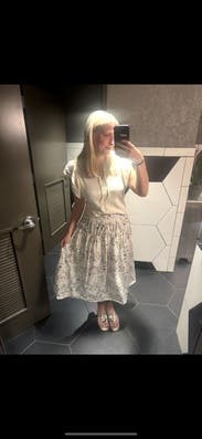 Wore this skirt a few times with a sweater. Felt a little bit too voluminous which I did not mind, but wished it lay a little bit more flat. The more I wore it the wider it got. The print colors were so pretty for Easter weekend. The waist is a side zipper with elastic in the back. It was a little tight, but I was able to zip it all the way up. I am 5' and it was the perfect midi length to wear with sneakers. As a NYC commuting girly, I did have to hold it up when going up and down the subway stairs.