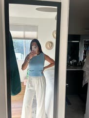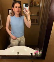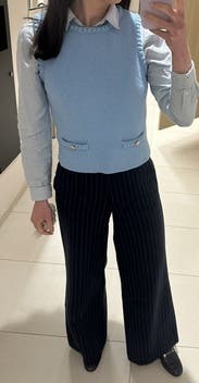 Wore with a puffed mid-sleeve collared button down, raw hem wide leg jeans, and gold flats. Got loads of compliments. It's a thicker vest so perfect for the spring!