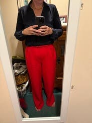 Comfy, colorful trousers. Fit true to size. I’m 5’4” and found the XS to be a good length with sneakers — if you’re on the shorter side you might need to wear with heels.