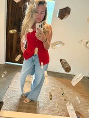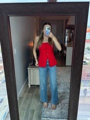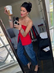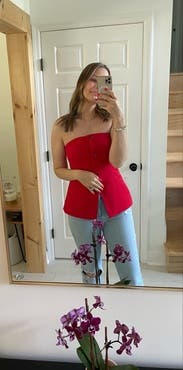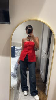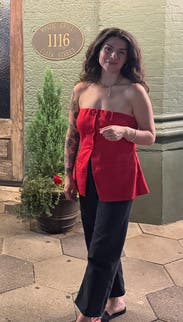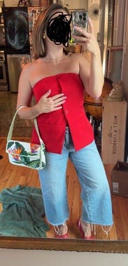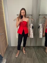 This top is so fun to wear dressed up or down. I’m glad I rented it instead of buying it because it’s probably a once and done type of fit for me personally because it’s so bold. It goes really nice with red nails! My only complaint is that I’m more pear shaped and the way the top is longer and flows out to the sides made me look really wide. @darby_dream_house for more pics/videos