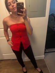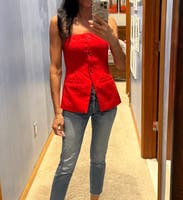 I’m 5’5, 120lbs. 34D. Ran big but has strong silicone grip. Best styled with the red pant or jeans, with dainty gold accessories.