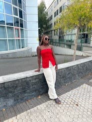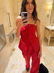 I wore this a few times as a set and I also styled the vest with a pair of jeans and heels. The vest fit me just right it has anti-slip inside so it stays put and I didn’t have to worry about it sliding down at all. The pants are meant to be a looser fit. They were a little larger on me than I would prefer, but since the vest covers the butt area that didn’t bother me! I would definitely rent this again!