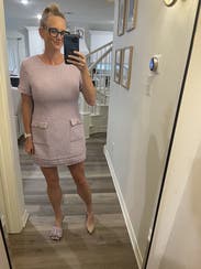 Obsessed - what a great quality dress. Loved the color. Thick tweed material so good for fall/spring