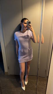 Loved this dress. Felt like a Channel type of dress. But it is on the shorter side. Fit perfect except the length. Loved the thick material and it looks very expensive in person. I dont think the picture does it justice. Not sure if I would’ve loved a larger size so the sizing is tricky with the shortness.