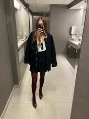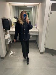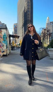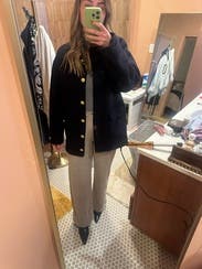 I love the elegant style of this jacket! The gold buttons are my favorite! It is very warm so you can wear it alone in the fall time but for the wintertime it would be worn as a blazer! The material feels a little itchy if worn with a short sleeve shirt - otherwise it shouldn’t matter. Definitely would rent again.