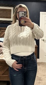 I received this 10 minutes ago and I already snapped a photo! I love this and I can tell I will wear this many times. It’s cropped but not too cropped on me (5’4). It’s very warm and not itchy at all. Perfect staple for the winter.