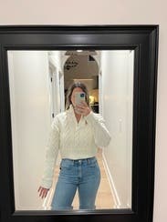 Such a nice and classy white sweater. Timeless piece. Cropped which is good for someone who is short like me.