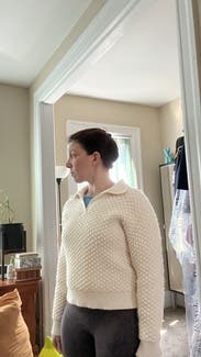 I loved this fit and look. It was a lot more interesting than your average cream sweater with the polo collar and the quilting. Could be worn with jeans or a skirt easily. The only downside is that it was itchy. I would still wear for hours but FYI if you are sensitive. Also despite the V neck it kept me very warm!