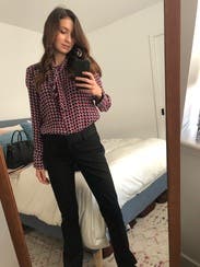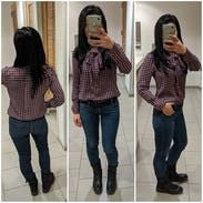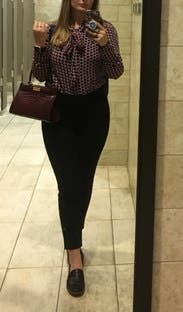 I thought this shirt was houndstooth, but it's actually stars...not my style at all. The fabric was also polyester feeling, meh! To top it off, it was tight in the hips and I couldn't button the bottom button (why I tucked it in).