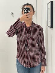 Nice thick, substantial fabric. The houndstooth print was cute with the red stars. I love a "built in" scarf tie on a nice blouse and this one was a good length. I was actually surprised how comfortable my broad shoulders felt in this shirt - I was worried that getting a size small (which fits the rest of my body) in a non-stretchy material might mean I have alligator arms all day, but low and behold, I can totally reach up, out and around with not restriction/constriction! I will definitely rent again. The shirt was not very new - upon very close inspection, it appears to have been dry cleaned a lot; HOWEVER, because of the thick fabric, it seems to have worn well - in fact, I would contemplate buying the shirt.