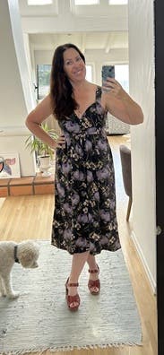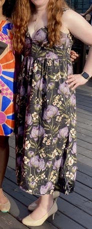 My boobs were absolutely smooshed and flattened in this one but I wore it anyway. Don’t know why the top is cut so small and so low. Love the pockets and lightweight fabric. Just felt tightly contained and exposed though I don’t think you can tell in the photo.