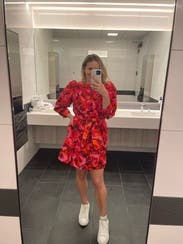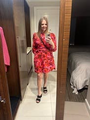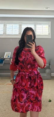 Love , love, love this dress! The colors are bright and vibrant. It even has pockets! It was a little billowy on the bottom, but the belt greatly helped ensure the waist showed rather than looking boxy. Would rent again.