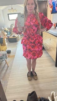 I love this print so much and the material feels good too, but it bunches up big time when you tie the matching belt around it and it makes the bottom look a little off. Loved the print, but the style did not work for my shape may work for somebody a little bit curvier or taller and thinner