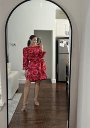 The shoulders plus the loose fit here is a bit too much fabric, which didn't feel flattering. However, the fabric is gorgeous in both color and pattern - looks very luxe. I wore it anyway (tied the middle sash tight) and still got compliments!