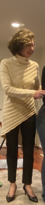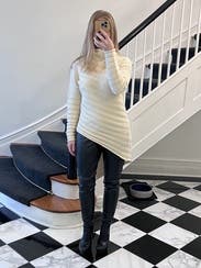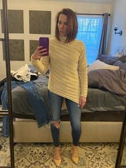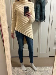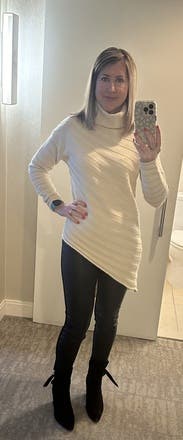 Wore this fun asymmetrical sweater with some commando leggings and knee high boots. The sweater is fun and I love the cut of it. It was flattering with a comfy turtleneck. I would rent it again.