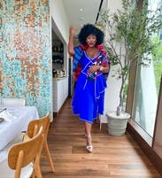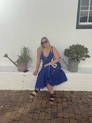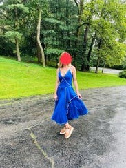 Beautifully tailored linen dress with gorgeous embroidery and structure. Received so many compliments. Great cobalt blue color. Low neckline and bodice are snug, perfect for smaller chested girls who could forego a bra (i didn’t wear one and was fine). Opens up into a swingy full skirt with lots of movement. Absolutely loved this dress. Note: needs a lot of steaming to get the wrinkles out, but worth it. Wore with cream/raffia high-heeled sandals and cream/raffia handbag. Such a fun dress!