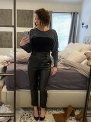 I was a little hesitant renting this one due to some of the reviews but I loved it! I love how the sleeves are glitter, the top is fitted and it sits perfectly above the waistline so it pairs well with a belt! Wore for dinner and a movie date night!