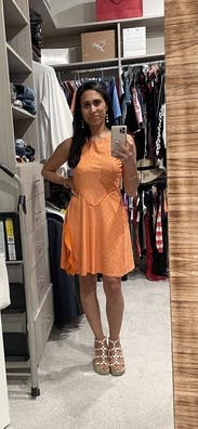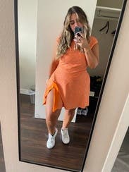 I loved this cute little dress and ended up purchasing it because it was on sale. The material is forgiving and comfortable even on hot Texas summer days and the side slit is sexy and cute and elevates it a bit. Some of the seams sit funny and rippled a bit but otherwise loved this one.