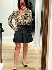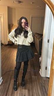 Wore this skirt so many times while I had it - honestly should’ve bought it. It’s a tad short for work but with tights it was perfect. Wore it out to dinner with bars with a leather jacket and platform boots and it was a great vibe - lots of compliments!