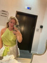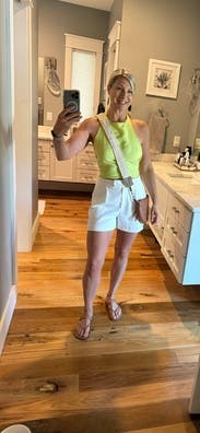 Cute top and such a great color. Required a steam every time I wore it and some boob tape helped keep it in place but wasn’t required. Great vacation or summer going out top.