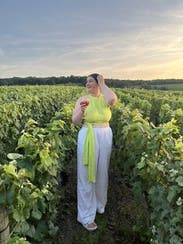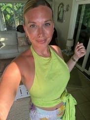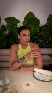 Gorgeous color. The shirt connects around your neck with a gold clasp in the back which was a really pretty detail. Material is thin and you can’t wear a bra so be prepared. I am a 34-C and did have some side boob if I moved around a lot without readjusting it. Overall, I loved the shirt to wear for a brunch date but I wouldn’t wear it dancing or for another activity with a lot of movement.