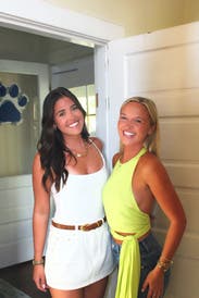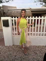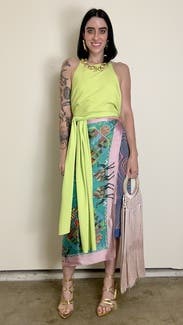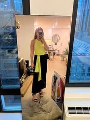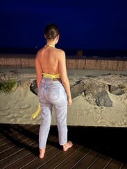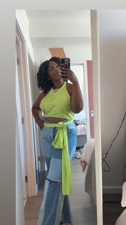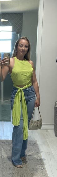 Loved the backless look and fit great for my frame. I had fun tying it in the back or on the side. Looked great with dark denim too but didn't snap a pic. Easy to wear and would love to rent it again.