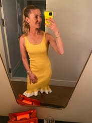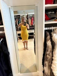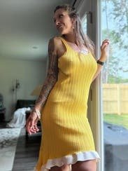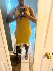 Beautiful marigold color, thicker sweater material with lovely shaped hem-I’m a perfectionist when wearing a dress that is so form fitting and wasn’t completely comfortable with the backside and tummy area, and will not wear shapewear-but this does have some forgiveness as it is thicker. It’s very pretty and a bra is easily worn.