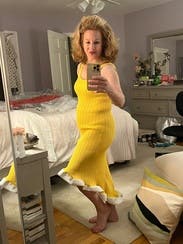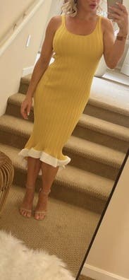 I chose it because I love yellow, but honestly I didn’t love it on me. Very form fitting. I got some random stranger compliments, but felt self-conscious about how it showcases your rolls and panty-lines, despite being a nice heavy structured knit. The skirt ruffle feels bouncy around your knees, would be fun to dance in.