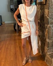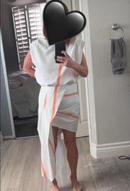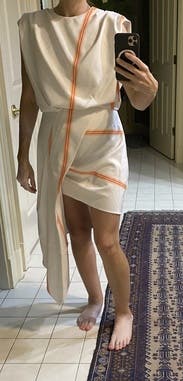 This dress is great! High quality and cool style. The dangled piece is a little too much fabric and I wish there were more orange stripes down the backside of the dress but other than those two things, perfection! I am traveling to Hawai'i next month, which is a super casual place, but this dress will work with sandals just fine. Easily dressed up with open toe / closed toe heels too. Ladies - this is a good one! Sizing wise - I typically wear a S/4 in dresses but because it wasn't available, ordered the 6. The 6 actually fits perfect. If you are between sizes or typically order down for dresses (like me), go with the larger size.