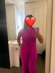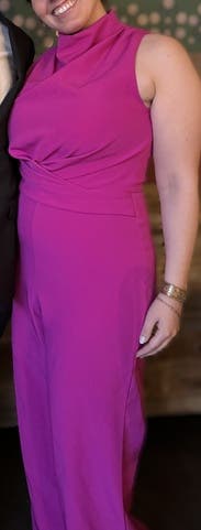 Beautiful jumpsuit & great color. It fit perfectly but I didn’t end up wearing it. I didn’t love the twisted material at the waist. Thought it made me look bigger than I am.