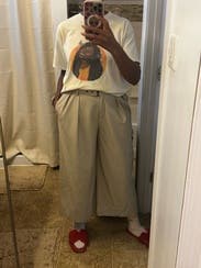 These pants are so cute and so stylish. I dressed them down with a cropped sweater and sneakers and also dressed them up with a sheer top and heels. They are the perfect fit. Narrow in the waist and wide leg. I would buy them if I wasn't in the midst of losing after baby weight.