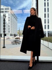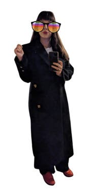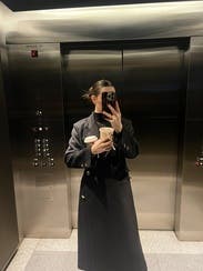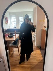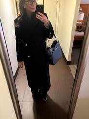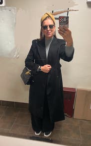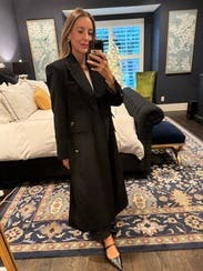 This coat is beautifully designed. An elevated classic black coat, thanks to being double breasted and the gold buttons. I wore it a ton and felt it elevated even a hoodie and jeans, but will say it attracts lint like crazy and I think that's what prevented me from buying it. It was always in need of a lint rollers assistance.