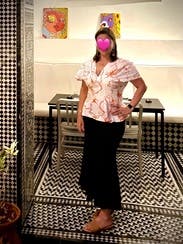 The waist is too tight and the shoulders are too wide. It will be fine if you go up two sizes. The color is really pretty.