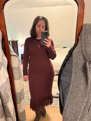 This was a really nice sweater dress, the fringe on bottom and open back makes it more chic. I needed shapewear underneath as it was a bit clingy in the stomach area despite being fairly thick fabric