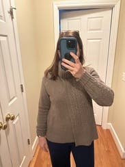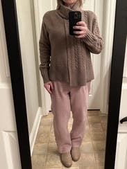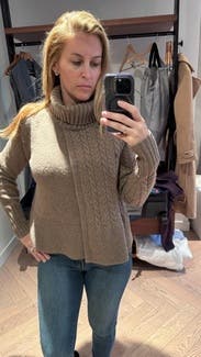 This sweater is beautiful and cozy and soft. Love the cabled detail, and the fit was great for me. I wore it with jeans and boots and felt very cute. I would absolutely have bought this if this price was a little lower.