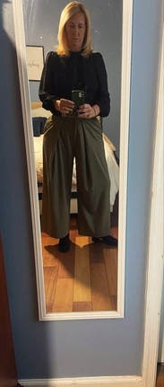 I paired these with a silk blouse and cashmere cardigan for a rainy day heading to the office. Pants are roomy and comfortable—the front pleats are off center which would keep me from investing in these.