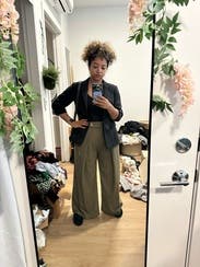 On the plus side, I loved the colour, the gold details, the fabric felt like good quality, and the deep pleats almost had a wrap around look that was a nice twist on many wide leg pants. On the negative side, the length was kind of cropped but not really, the fabric hung in a way that the line of the pleats got lost half way down, and there was way too much fabric around the crotch which bunched at looked odd. I did find these a bit big - perhaps sizing down would have them more up on my natural waist and alleviate some of the above issues.