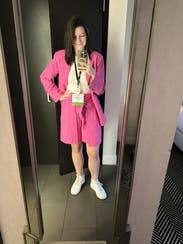 I stood out in the best way with this vibrant pink set. It didn’t wrinkle as badly as I feared and the shorts were long enough to be work appropriate