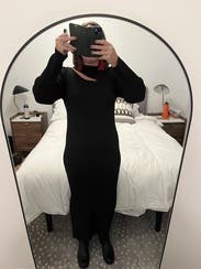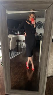 Cute dress and I got a lot of compliments. Pros: flattering (I had to wear spanx tho), easy to wear dress great for date night or a party (dress it up with fun earrings) Cons: a bit itchy on the skin, and hugs the hips very tightly (so you may need shapewear). I was a little cold in it, it's long sleeve but not warm because of the synthetic material. Would rent again for a casual party.