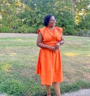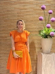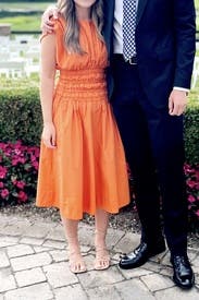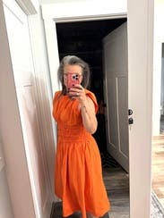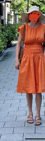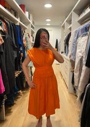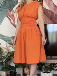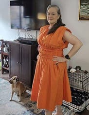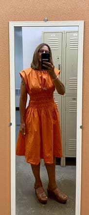 This bright orange dress is bold, cheerful, and eye-catching. The smocked waist gives it a flattering, cinched shape while still comfortable and easy to wear. I don't think I've ever looked so thin. Many folks asked if I lost weight. I'll take it as a compliment. The pleats through the skirt add movement, and the cap sleeves balance nicely. It’s the kind of piece that makes a statement all on its own—perfect for summer.